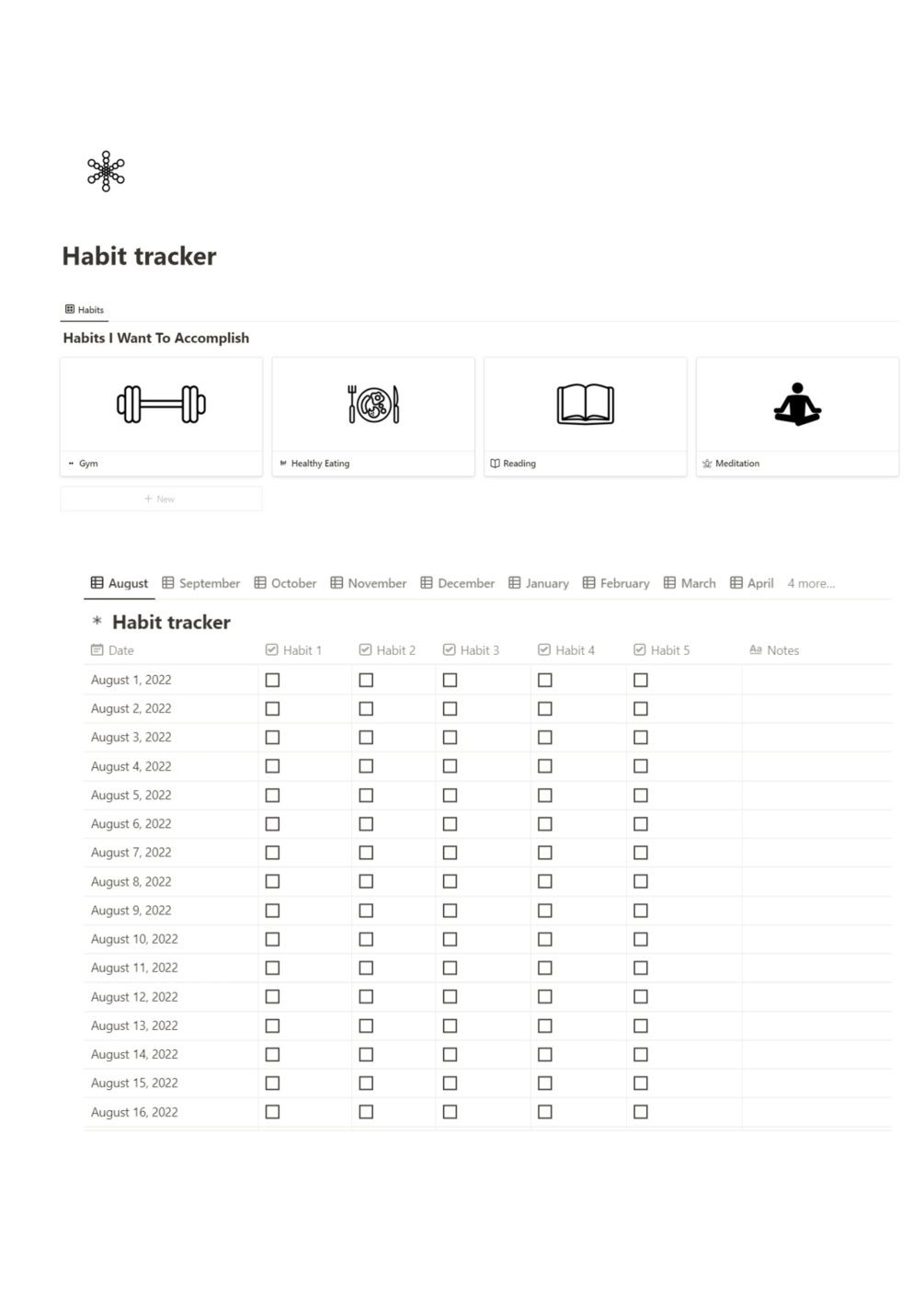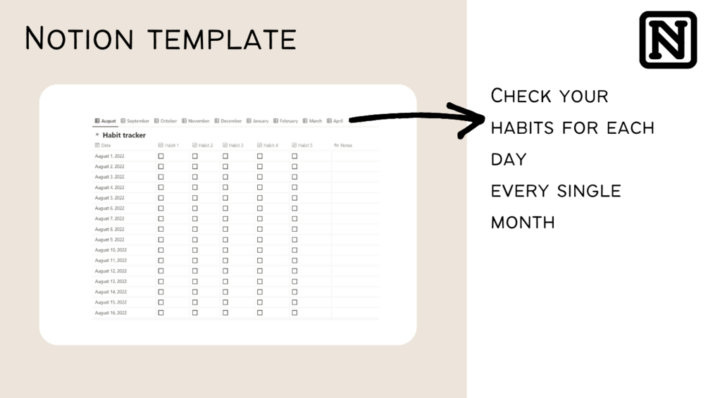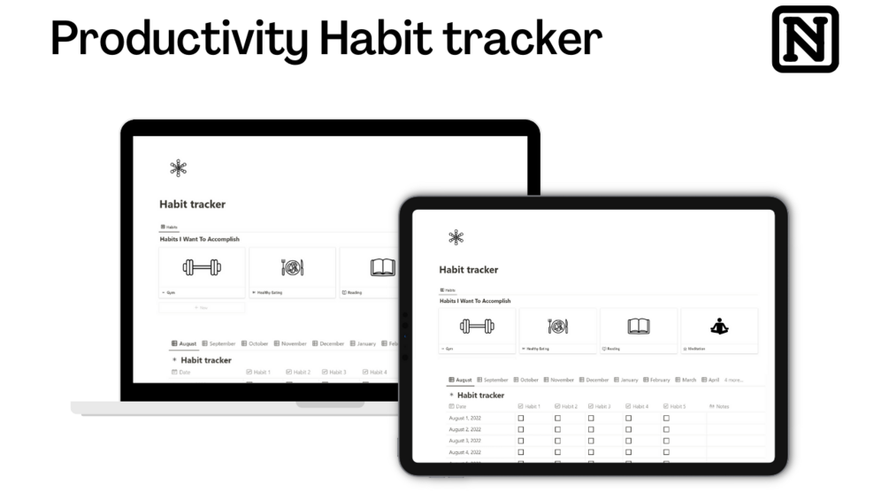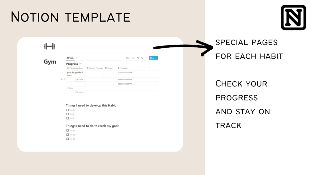 A notion template to keep track of your habits to help you build positive habits. You will get a notion dashboard with specialized pages for each habit.