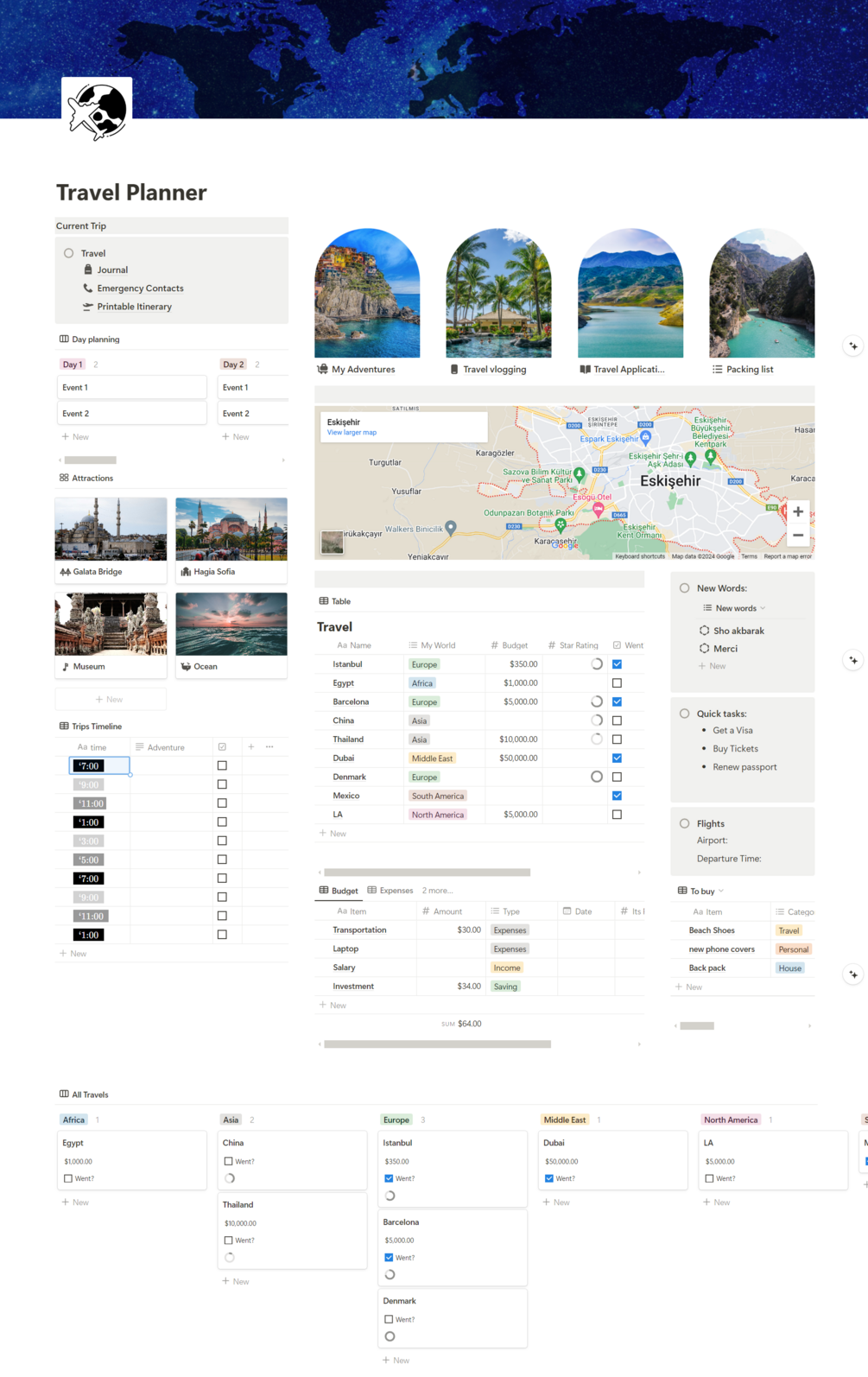 Whether you’re an occasional traveler or a seasoned globetrotter, this template is designed to cater to all your travel needs. Say goodbye to the chaos of scattered travel details and welcome a new era of seamless travel planning. With the Notion Travel Template, you can effortlessly manage your travel goals, itinerary plans, and finances all in one place.