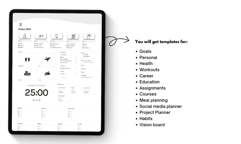Step into the new year with a tool that’s as ambitious as your dreams. The Vision 2025 Dashboard is not just a template—it’s your personal roadmap to an organized, productive, and balanced life. Whether you’re managing school assignments, planning business projects, or carving out time for self-care, this all-in-one dashboard has everything you need to stay on track, achieve your goals, and feel in control.