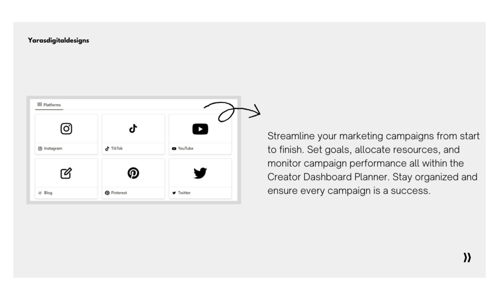 - Campaign Management: Streamline your marketing campaigns from start to finish. Set goals, allocate resources, and monitor campaign performance all within the Creator Dashboard Planner. Stay organized and ensure every campaign is a success.